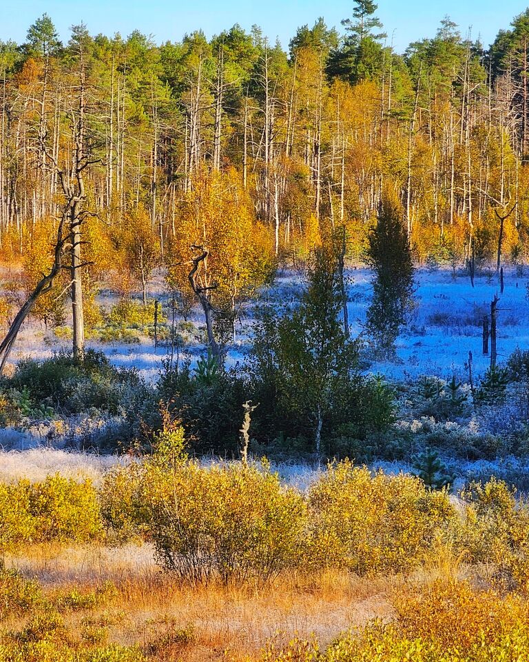 En tur upp till mossen på morgonen. Det är minusgrader och solen börjar tina upp frosten. Efter ett tag är det flera plusgrader.